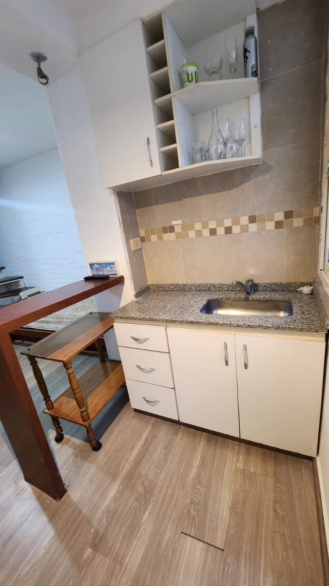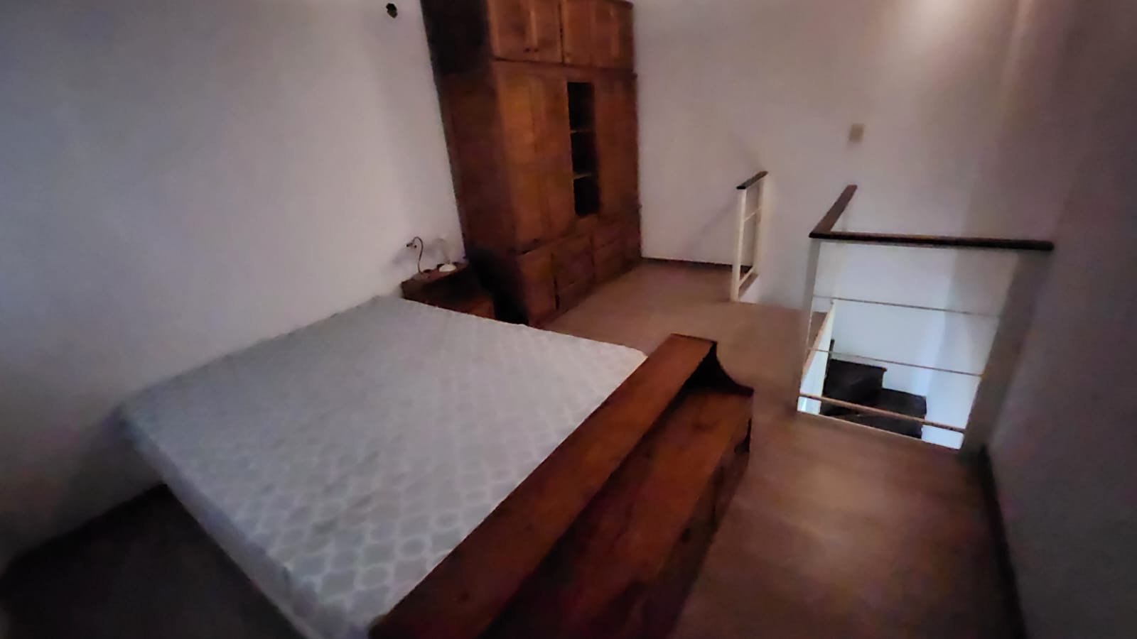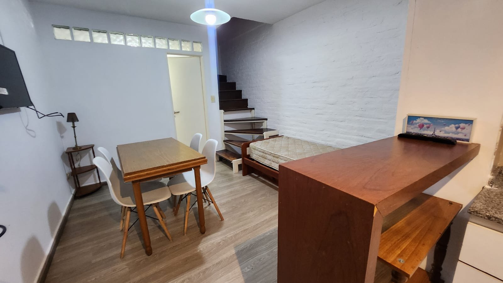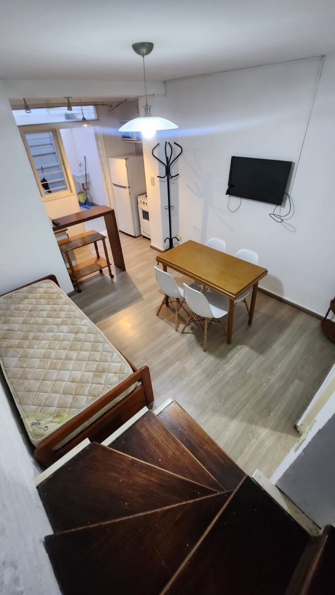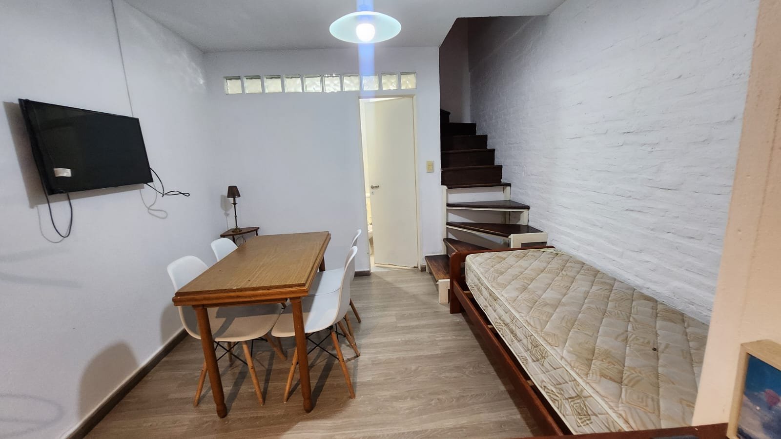 Ingresos al patio con acceso al estar con cocina integrada, baño completo con ducha debajo de escalera y en la planta superior, habitación con cama matrimonial y placard.