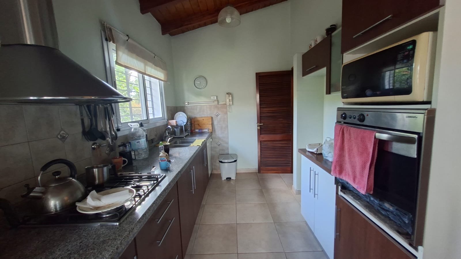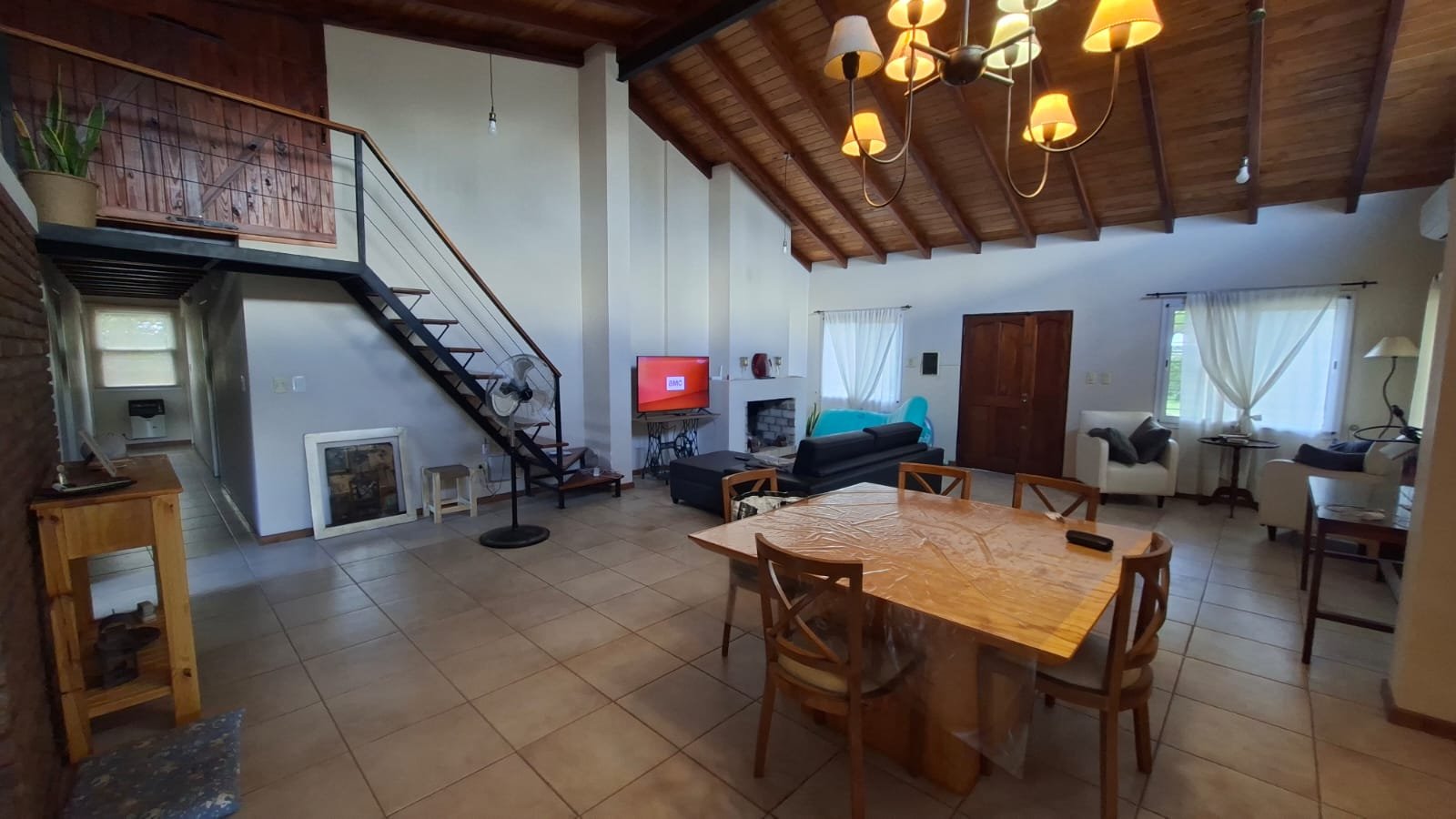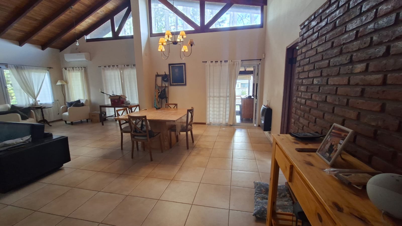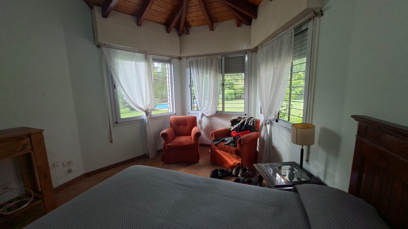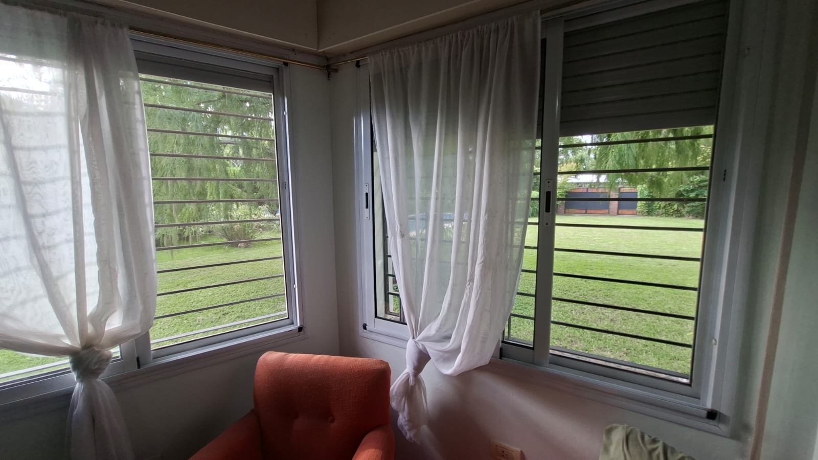 Estar comedor amplio, en doble altura, con hogar y ventanales al jardín. Cuenta con 2 dormitorios con vistas al parque y un tercer dormitorio o comodín hacia la doble altura del estar comedor. Techos inclinados con tiranteria de madera y cubierta de pizarra francesa. Cocina completa, equipada con gas natural. Lavadero independiente. Calefaccionada y refrigerada en todos sus ambientes. Galería lateral con parrillero, anexa al estar comedor. Piscina de 12 x 5 con bomba y filtro.